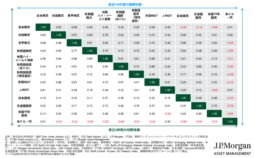 以下は米国の投資銀行J.P.Morganの資産運用会社が公表している、直近10年と3年の各資産クラスの「相関係数」を示した表です。