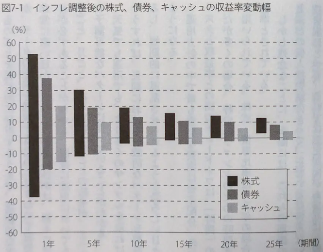 最後に、米国の有名な投資本「敗者のゲーム」から、株式や債券、現預金に投資した場合の、投資期間ごとの成績について紹介します。