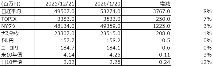 米国はベネズエラ攻撃やグリーンランド問題、パウエル議長の刑事告訴など、相変わらずトランプ政権の動きが予測不能ですが、株価や債券利回りの動きとしては大きな波乱はまだ起きておらず、比較的穏やかな動きとなっています。