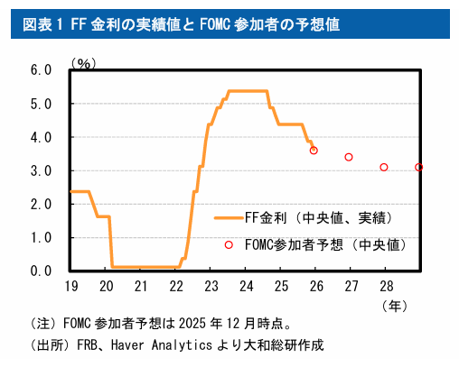 今後の株価を占う上で注目の政策金利はドットチャートでは2026年は0.25%の引き下げが中央値となっていますが、FOMCの中でも意見は割れています。