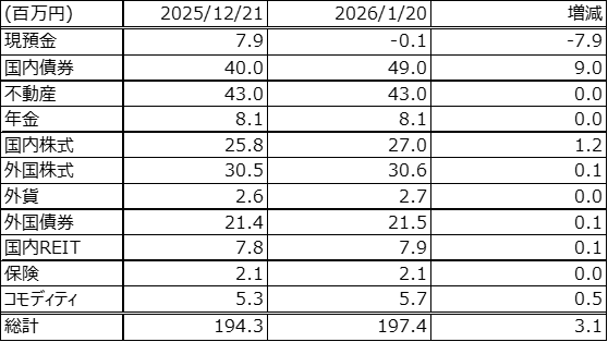 前回更新時(2025/12/20)から資産は約3.1百万円増加しました。
