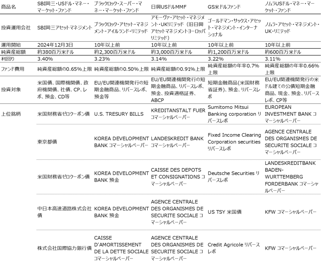 こうして見ると、同じ米ドル外貨建てMMFでも中身はけっこう違います。