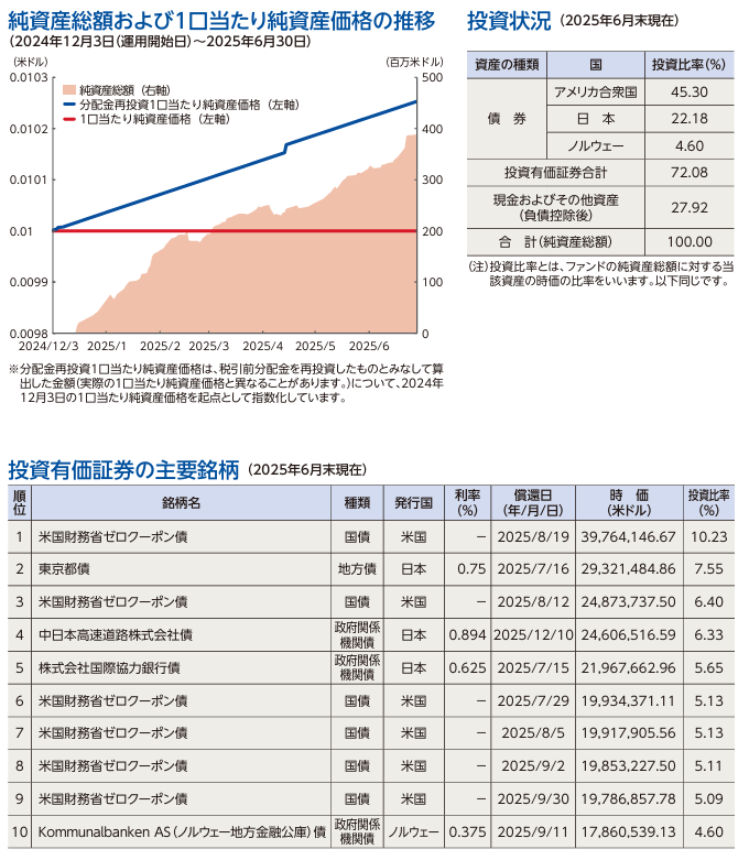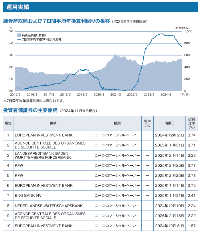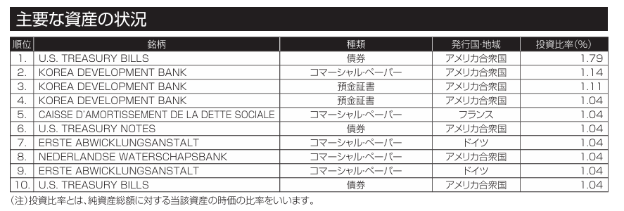上位銘柄は米国およびEUで発行された米国債、金融機関発行のCP、預金です。