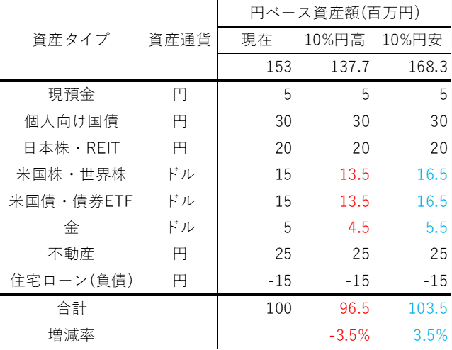 この場合、10%の円高で資産総額は100から96.5へと、3.5%減少します(為替レート以外の株価や金利は動かない前提での増減です)。