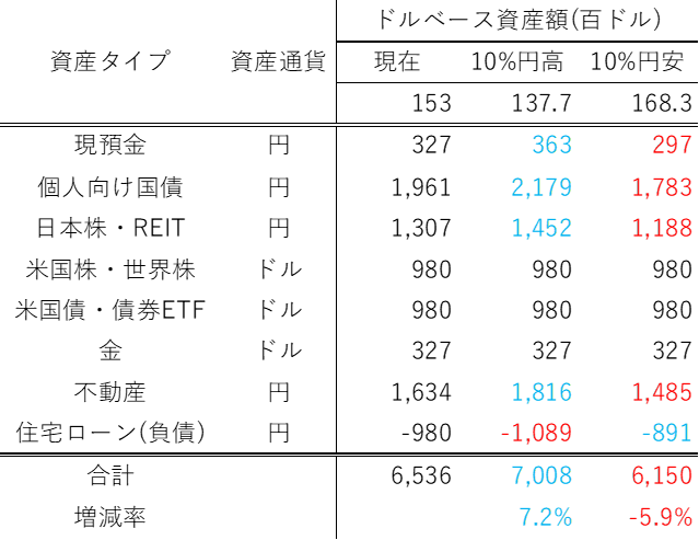 - 注:円建て負債(住宅ローン)は、円高になるとドルベースでは増加(「不利側」なので赤字表記)、円安になるとドルベースでは減少(「有利側」なので水色表記)となりますが、ややこしいので無視してもらってもいいです。