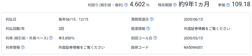 残期間約9年で利回りが4.6%。クーポンは5.85%です。