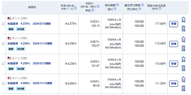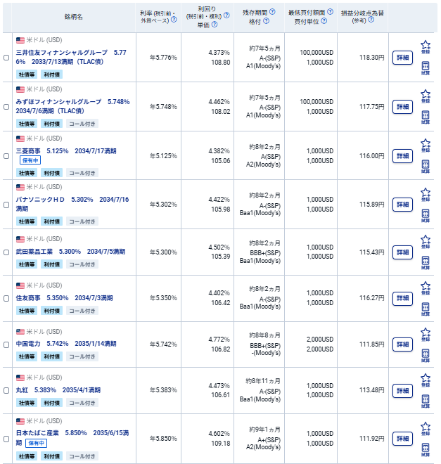 日系企業が発行する残7~9年の米ドル建て社債の中では格付けが高い割に利回りがよいです。