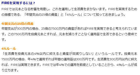一般的にFIREを実現するのに必要な資産は以下のように説明されています。