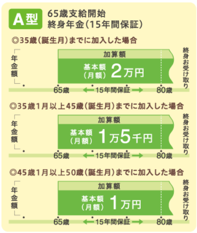 「国民年金基金」には、受給期間等が違う複数の型がありますが、いずれも加入年齢と加入口数によって「掛金(支払う保険料)」と「年金受給額」が決まります。