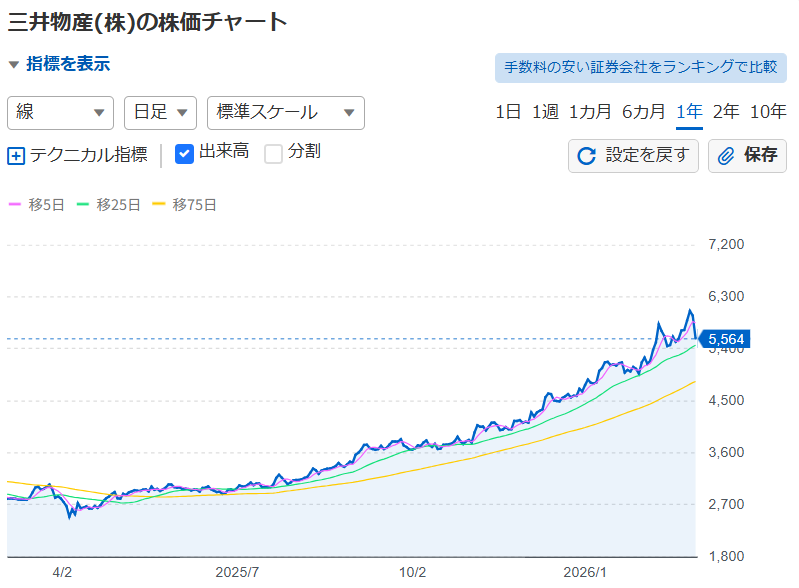 例えば三井物産の株価は2,780円(2025/3/5)から5,962円(2026/3/5現在)と2.1倍になっています。
