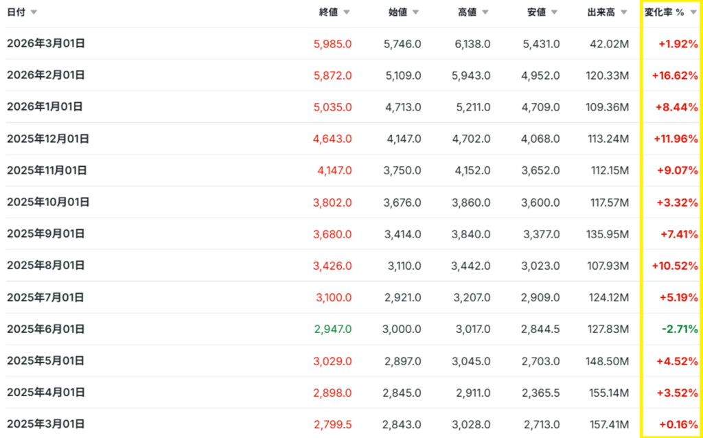 毎月の株価の変化率をみると、保有しているだけで毎月資産がどんどん増えていったのがわかります。