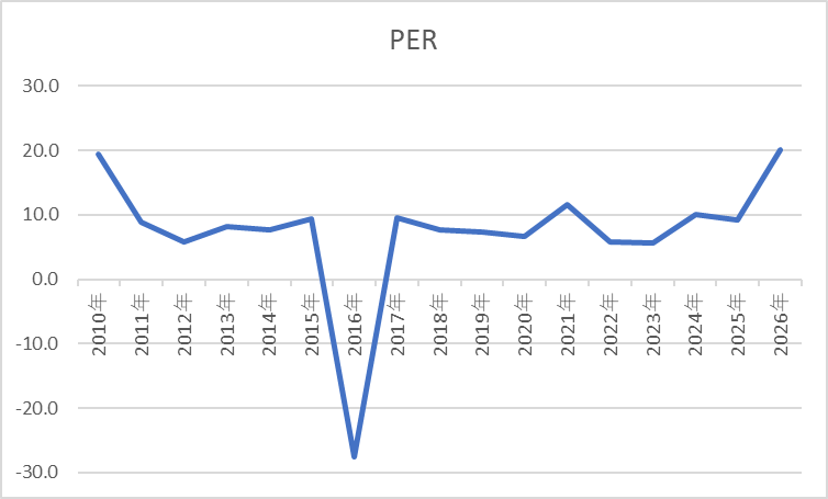 2025年までは同社のPERは10倍前後でしたが、いまは20倍です。