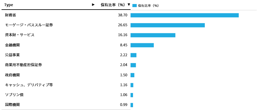 ポートフォリオのうち米国債が38%を占めており、リスクの低い債券に投資をしています。