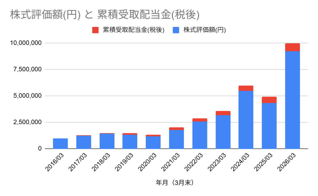青色が投資元本(株式評価額)、赤色が累積受取配当金です。