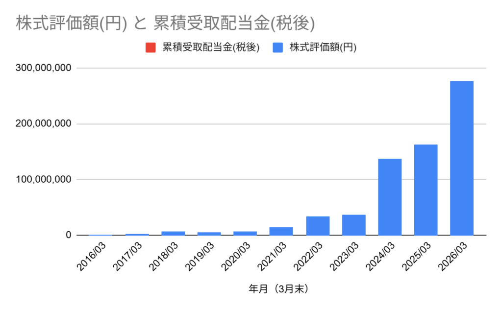 株式評価額が100万円から2億7,600万円となり、累積受取配当金が23万円です。