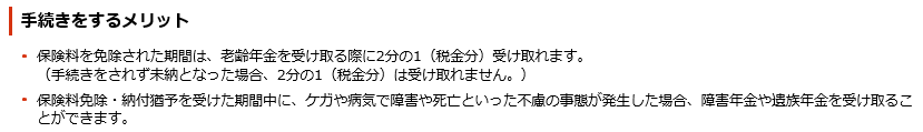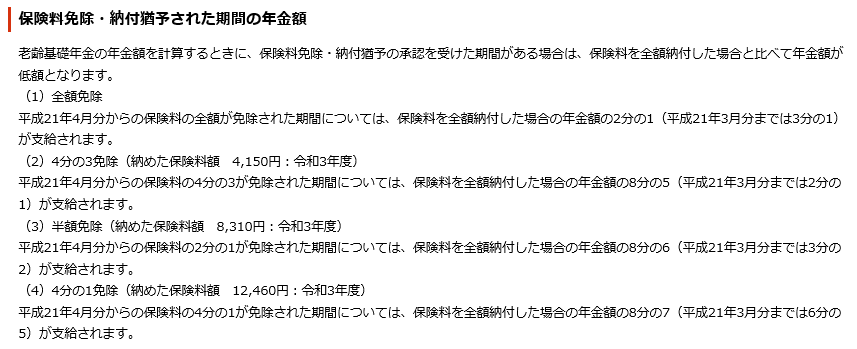 一方で、例えば全額免除を受けた場合、免除期間に相当する部分の将来受取年金額は1/2に減少します。