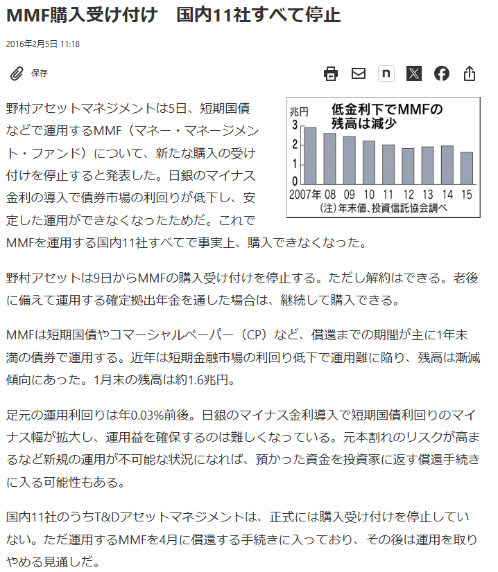 以下は2016年の日経新聞の記事ですが、当時マイナス金利導入により、MMFは運用ができなくなりました。