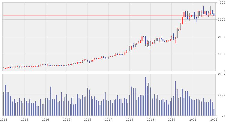 過去10年をみると10倍ほどに上昇していますが、2020年前半に大きく上昇した後は1年半ほど横ばいになっています。