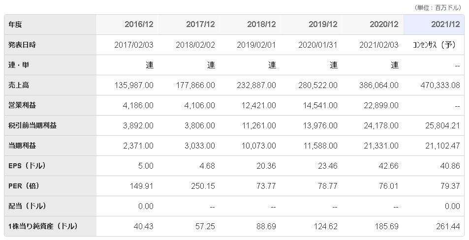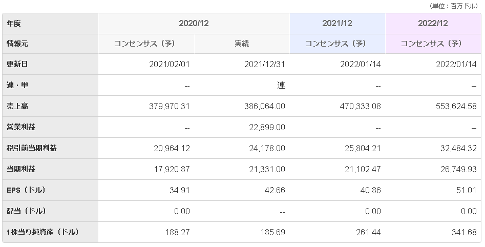 EPSの動きを見ると、2019/12から2020/12に23.46ドルから42.66ドルに182%と大きく伸びていますが、2021/12の予想は40.86ドルと約4%ダウンしています。