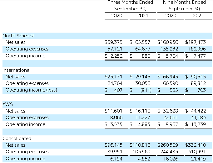 セグメントは、北米、国際、AWS(Amazon Web Service=クラウドサービス)の3つに分かれています。