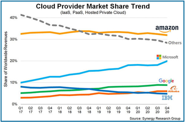 アマゾンのシェアはトップで約32%。2位マイクロソフトが猛追している状況です。