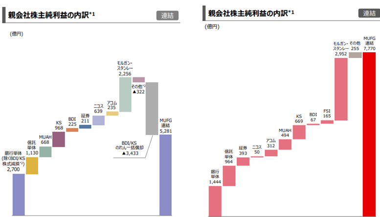 2021/3期だと2,952億円(約38%)、次いで銀行(単体、MUAH、KS、BDI)が2,674億円(34%)、信託(信託単体、FSI)が1,129億円(15%)、証券393億円(5%)、消費者金融カード信販(ニコス、アコム)362億円(5%)。