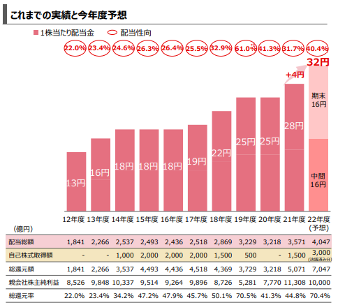 2023/3期は1兆円の利益予想となっており、配当予想32円、配当性向40.4%から計算するとEPS予想は79.5円になります。