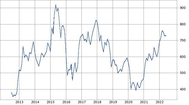 過去10年の動きを見ると400円から900円ぐらいの幅で上がったり下がったりです。