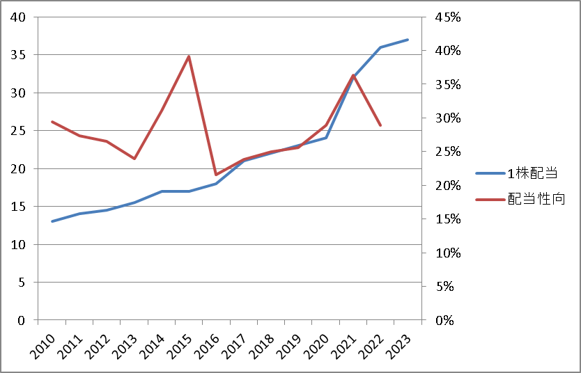 配当性向も30%弱と、多少利益が減少しても現在の水準の配当を続ける余地は十分ありそうです。
