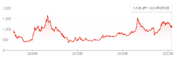 株価は緩やかな右肩上がりで、2022/6/3現在は1,120円です。
