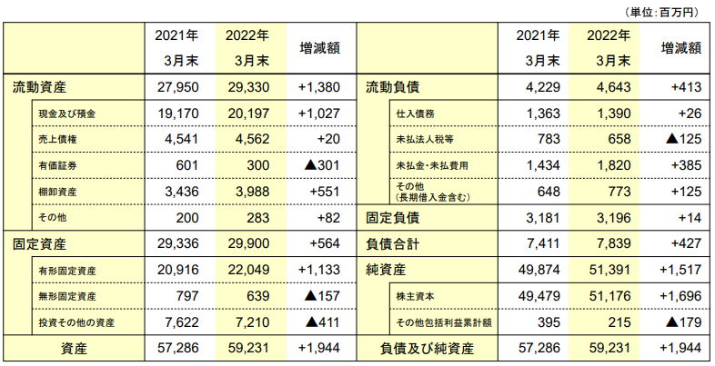 以下は2022/3のソフト99の貸借対照表です。