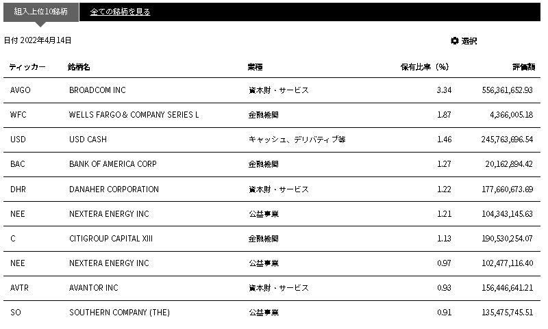PFFは優先株式で運用するファンドで、ファンドの純資産総額はUS169億ドル(約2兆円)の規模があります。
