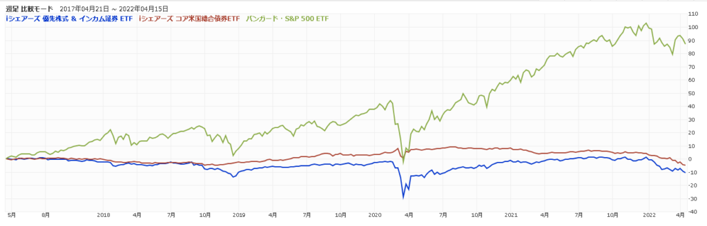 優先株式に投資するETFなので、普通株式より下落は小さかったですが、債券よりははるかに大きな下落です。