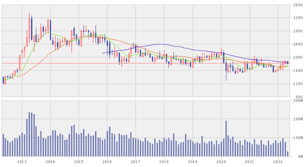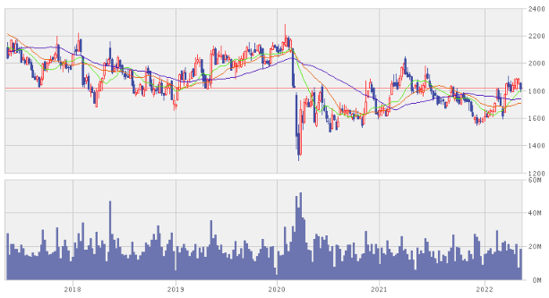 例えばコロナ初期には2,200円前後から1,400円弱まで40%程度下落しました。