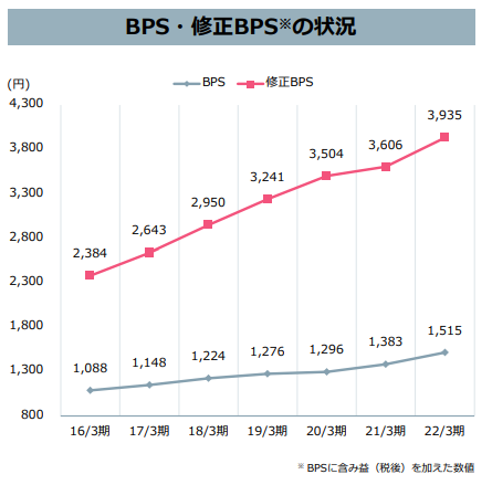 一方で、先ほどの保有不動産の含み益を考慮すると、修正BPSは3,935円ですので、PBRは0.46倍程度になり、現在の株価は含み益を考慮すると割安な水準と思います。