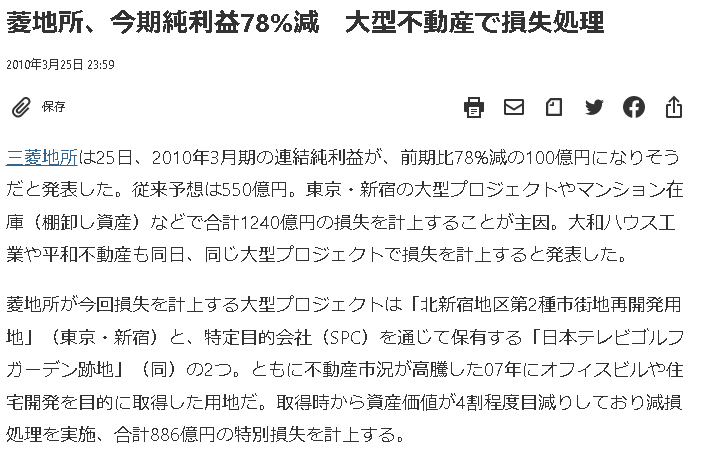 三菱地所は不動産開発、売却という事業も行っていますので、仕入れや売却のタイミングでの不動産価格の変動により、減損などで業績が悪化することもあります。