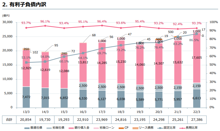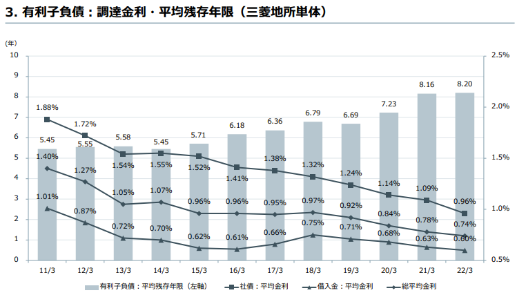 三菱地所は2022/3時点で2兆7,000億円程度の借入、社債があります。