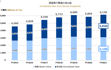 同社の開示資料によると、2022/3末時点で保有する賃貸不動産の含み益は約3兆円あります。