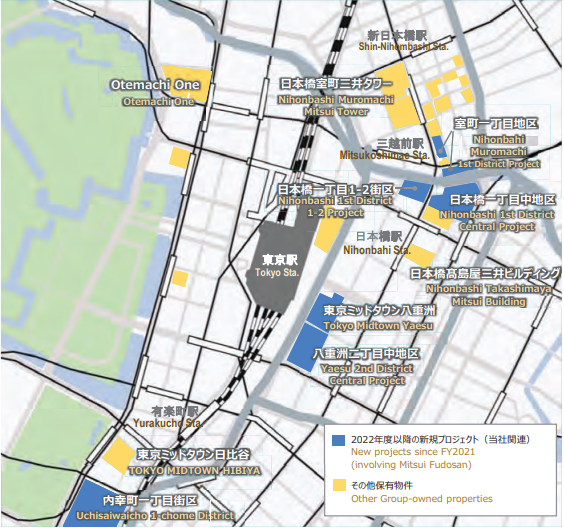 丸の内に物件を多数保有する三菱地所と対照的に、三井不動産は東京駅八重洲側、日本橋周辺の物件を多く保有しています。