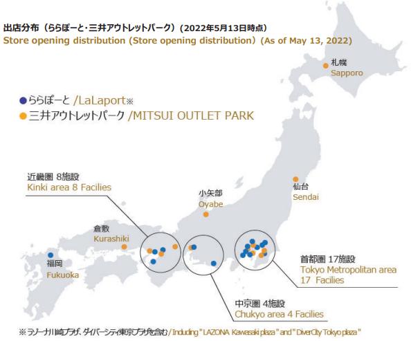 オフィスビル以外にららぽーとや三井アウトレットパークといった商業施設や物流施設も保有しています。