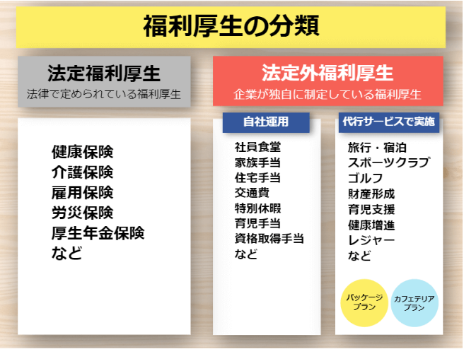 福利厚生には、法律で定められているものと、企業が独自に制定しているものがあります。