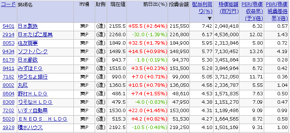また、金融株が5社(日本郵政、みずほ、ゆうちょ、野村、りそな)入っていますが、今回は対象から外しました(金融株のおすすめの高配当銘柄についてはこちら)