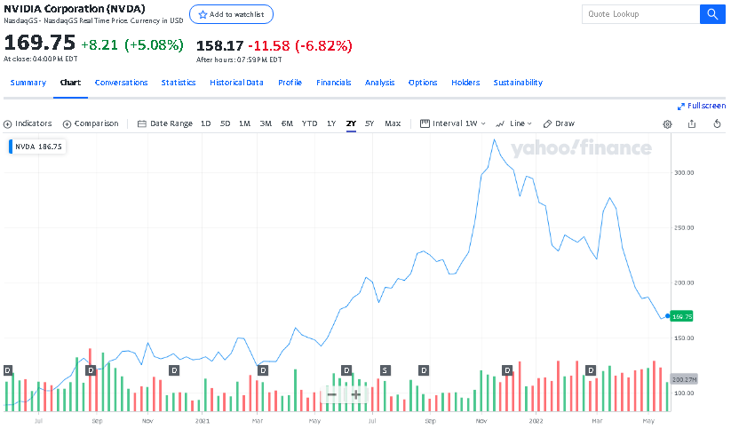 エヌビディアの2022/5/25の終値は169.75ドルでしたが、マーケットが閉まった後のアフターで6.82%下落し158.17ドルとなっています。
