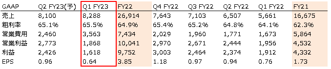 結果は、Q1の売上、EPS(Non-GAAP=一過性要因除く)は市場予想を上回ったものの、Q2のガイダンス(予想売上)が市場予想を下回りました。