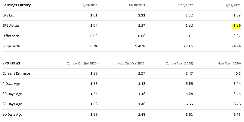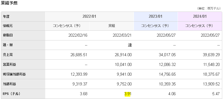 このEPSを前提に考えると、158ドル÷3.84ドル=PER41倍となり、足元で売上、利益成長に不透明感が出てきている中では、割安とは言えないかなと思います。